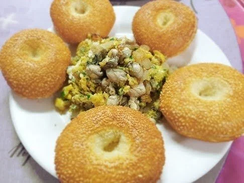 Jiguang cake is a traditional baked bread that originated as a military ration due to its durability and ease of storage. In Matsu, it is often sliced open and filled with braised pork, eggs, or mussels, turning it into a popular local snack. The cake carries both historical significance and everyday familiarity for island residents.